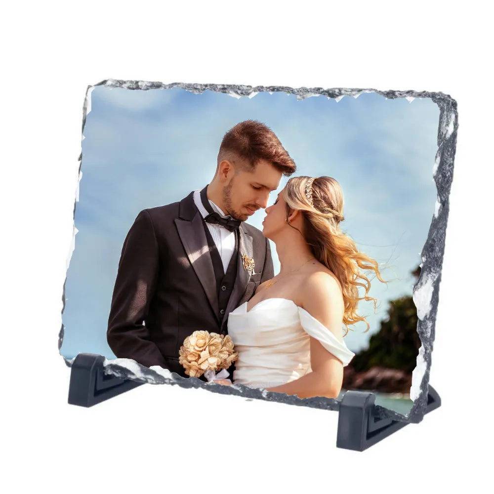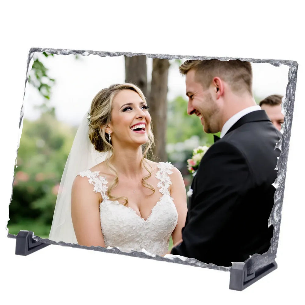 Vi trycker din bild direkt på den naturliga skifferytan. De råa, huggna kanterna gör varje platta helt unik – precis som er relation.